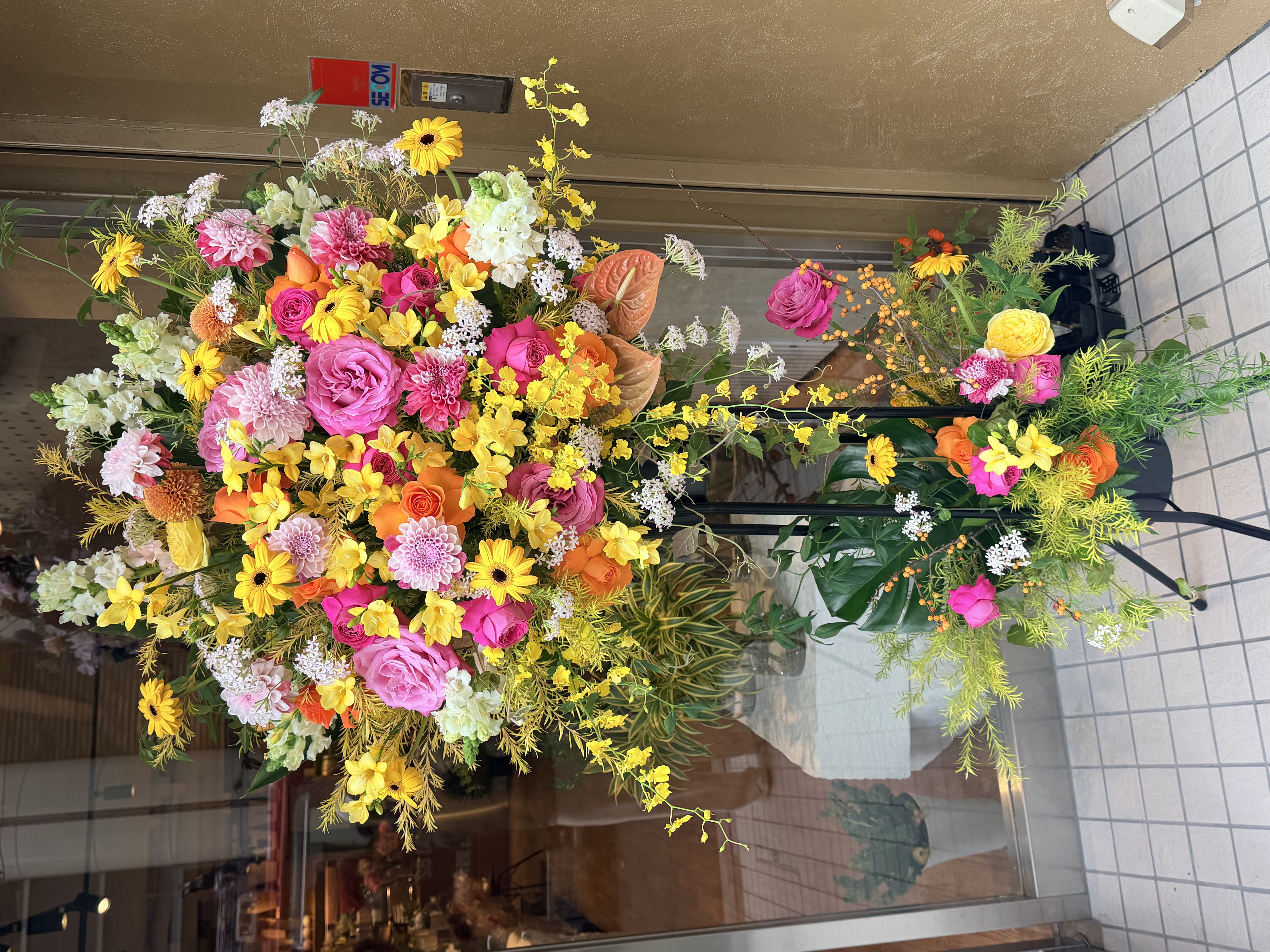 御開店や周年やイベントなどのシーンにお使いいただける、旬の花材をふんだんに使用したスタンド花です。